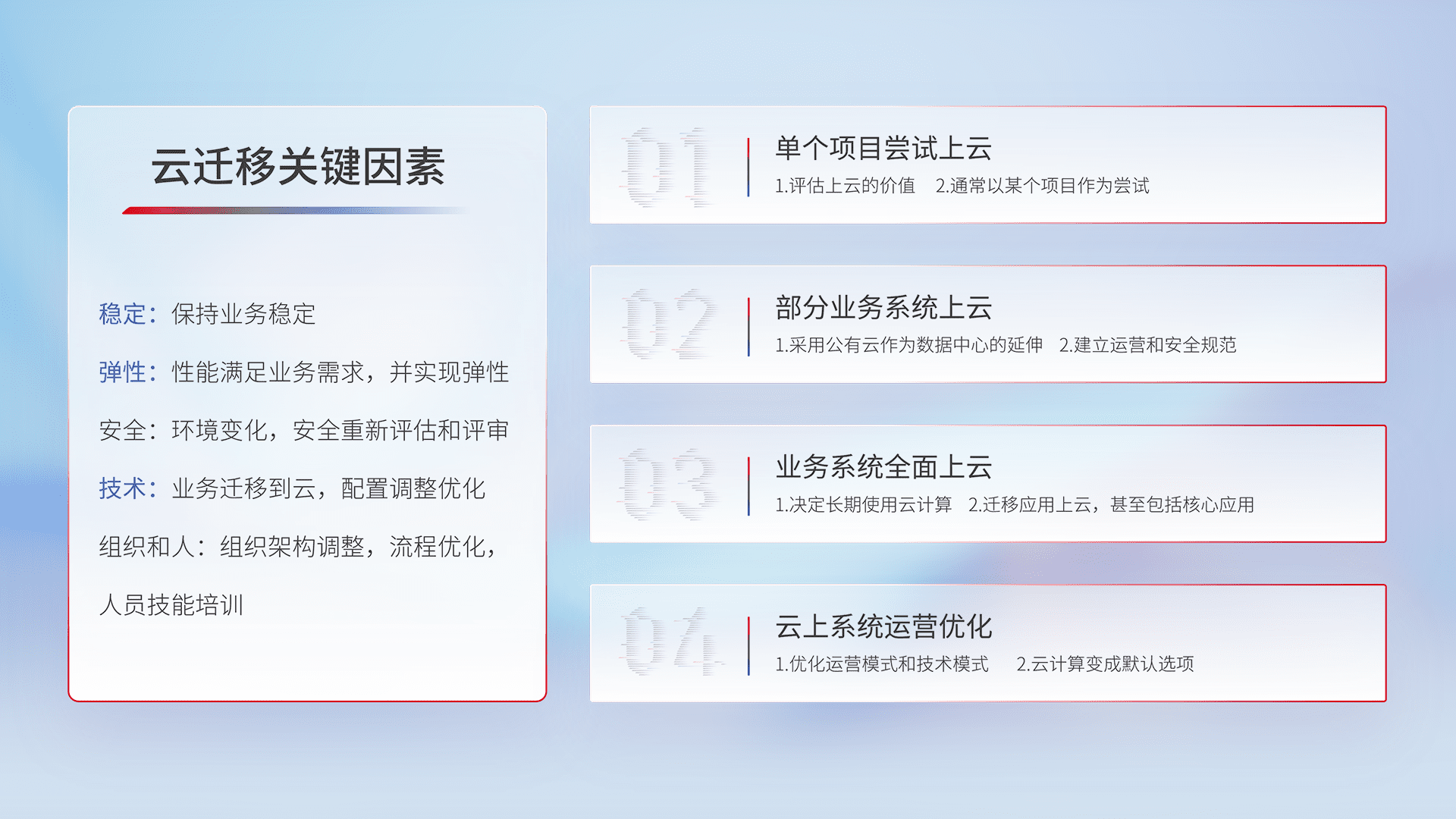 结合实际业务,,从规划设计、、云平台选型、、、云原生改造、、数据迁移、、集成交付,,迁移全过程为客户识别最佳上云路径,,,做好风险识别管理,,设计网络架构、、身份权限、、、、安全审计合规、、操作审计、、、日志审计、、、、监控告警策略、、、、多站点容灾设计等,,,对云上基础设施进行整体规划,,提升IT治理水平,,,以满足弹性、、高可用、、高性能的需求。。。。