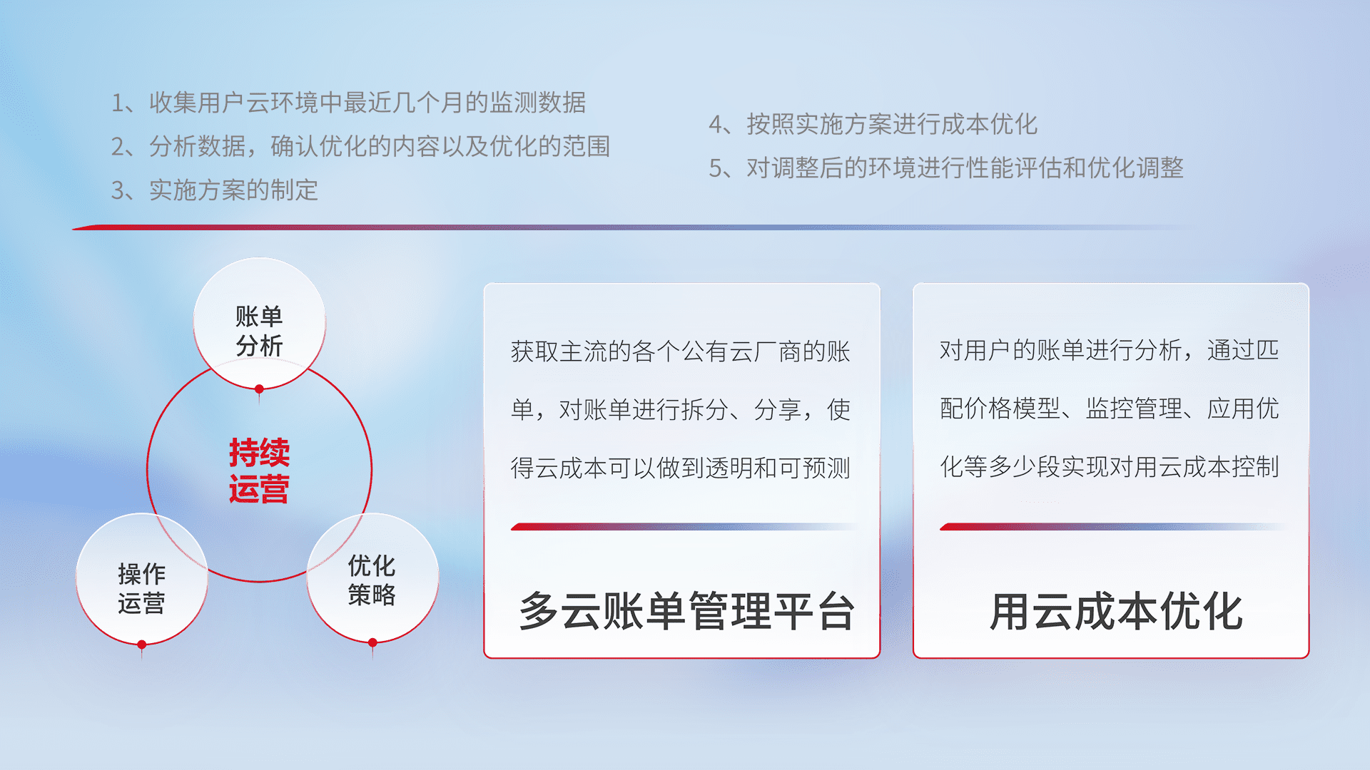 通过多云纳管,,,,以统一的资源数据模型把客户的云资源进行抽象和封装,,,,进而实现对多云资源的统一操作,,,,保障云资源管理的可靠性、、、稳定性与可用性。。。。量身定制化运维内容,,配置、、、、开发运维、、、、补丁管理、、备份、、监控、、、认证和访问管理、、审计和日常巡检等,,保障在用云过程中的可靠度,,稳定度以及高可用率。。