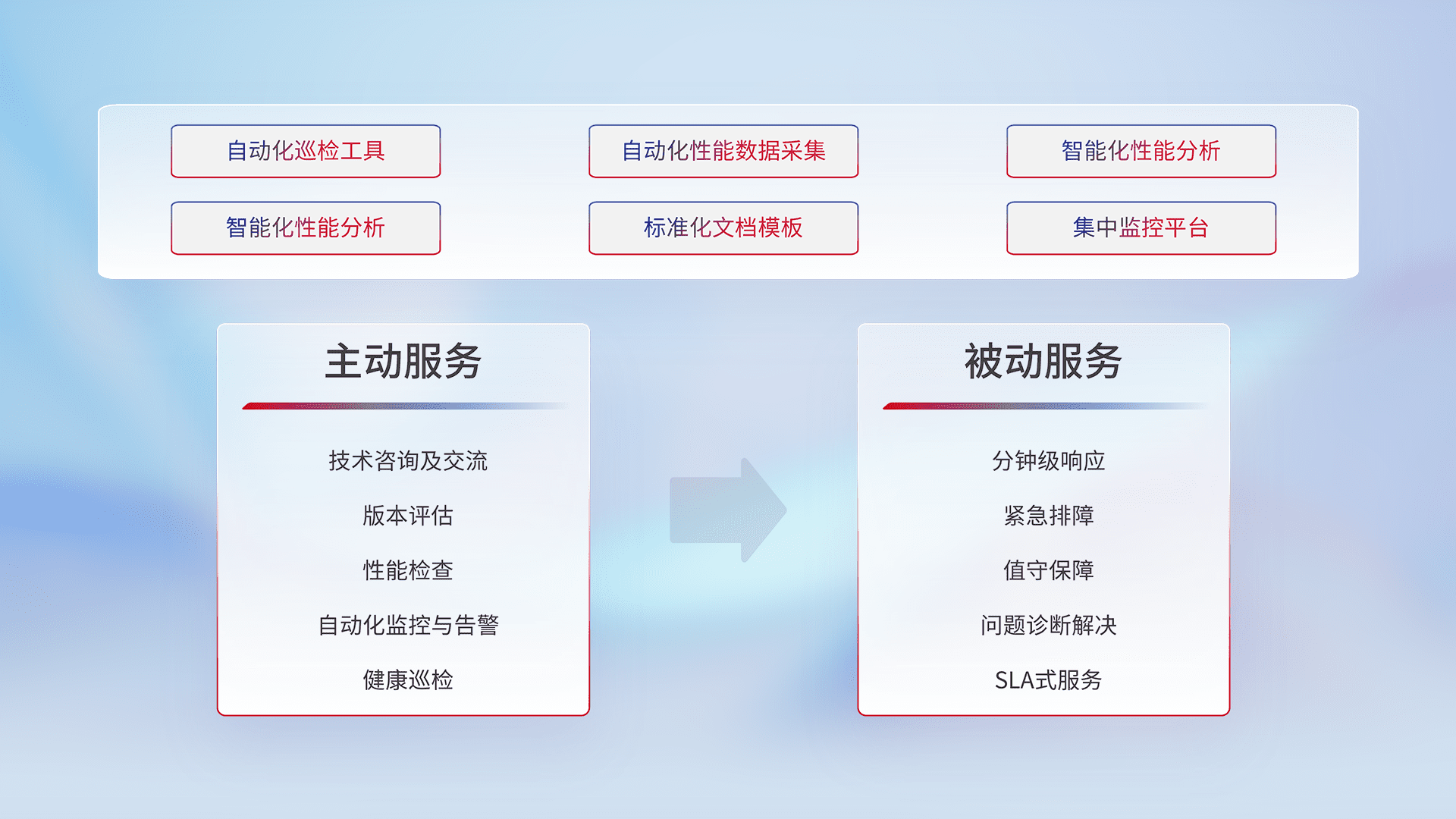 智能化工具和标准化文档,,保障服务质量,,,,提供主动服务(包含技术咨询、、、、版本评估、、、性能检查、、、、自动化监控与告警、、、、健康巡检)和被动服务包含(分钟级响应、、、紧急排障、、值守保障、、问题诊断解决、、、、SLA服务)。。。